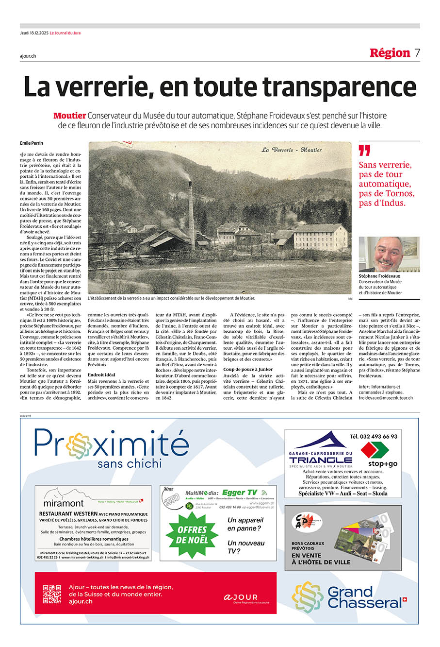 18 décembre 2025 : Article de Catherine Bürki concernant la parution de l’ouvrage dédié à l’histoire de la verrerie de Moutier « La verrerie en toute transparence - de 1842 à 1892 » rédigé par Stéphane Froidevaux et édité par le MTAH. ...